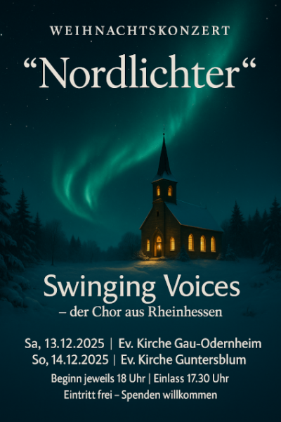 Beim diesjährigen Weihnachtskonzert nehmen die Swinging Voices ihr Publikum mit in den hohen Norden: Schnee verzaubert die Landschaft weihnachtlich und die Nordlichter lassen den Himmel vielfarbig aufleuchten.